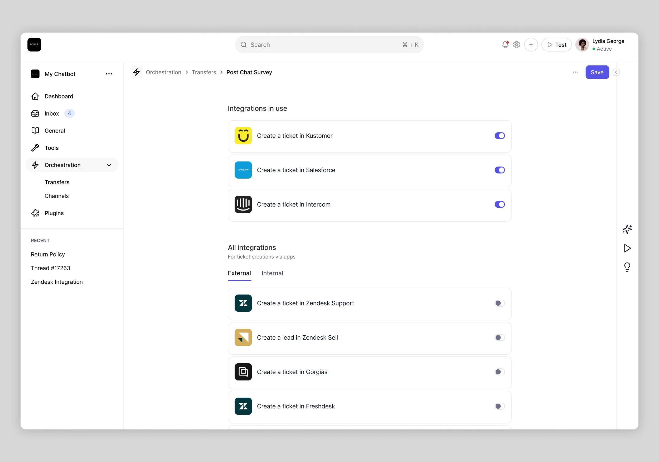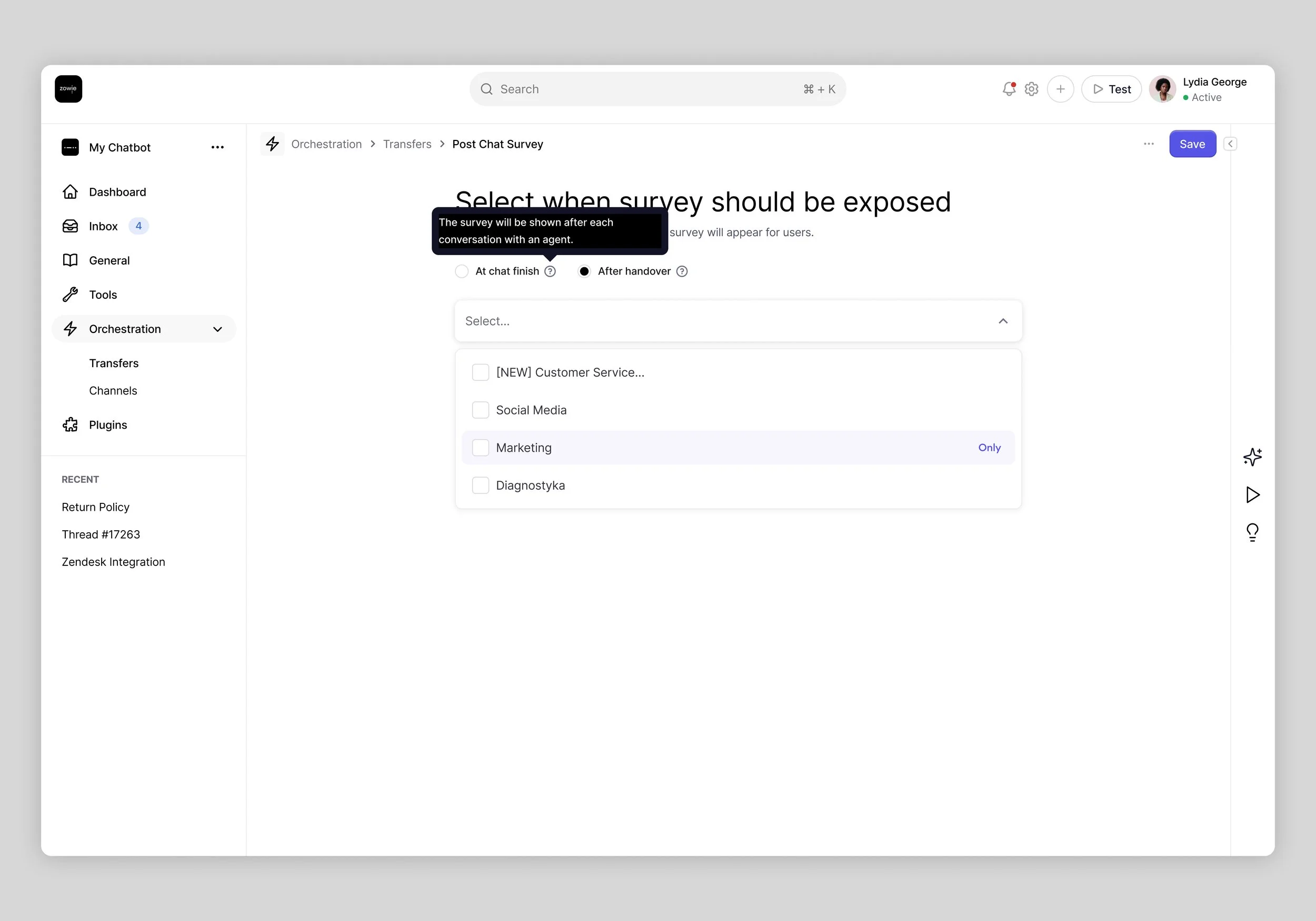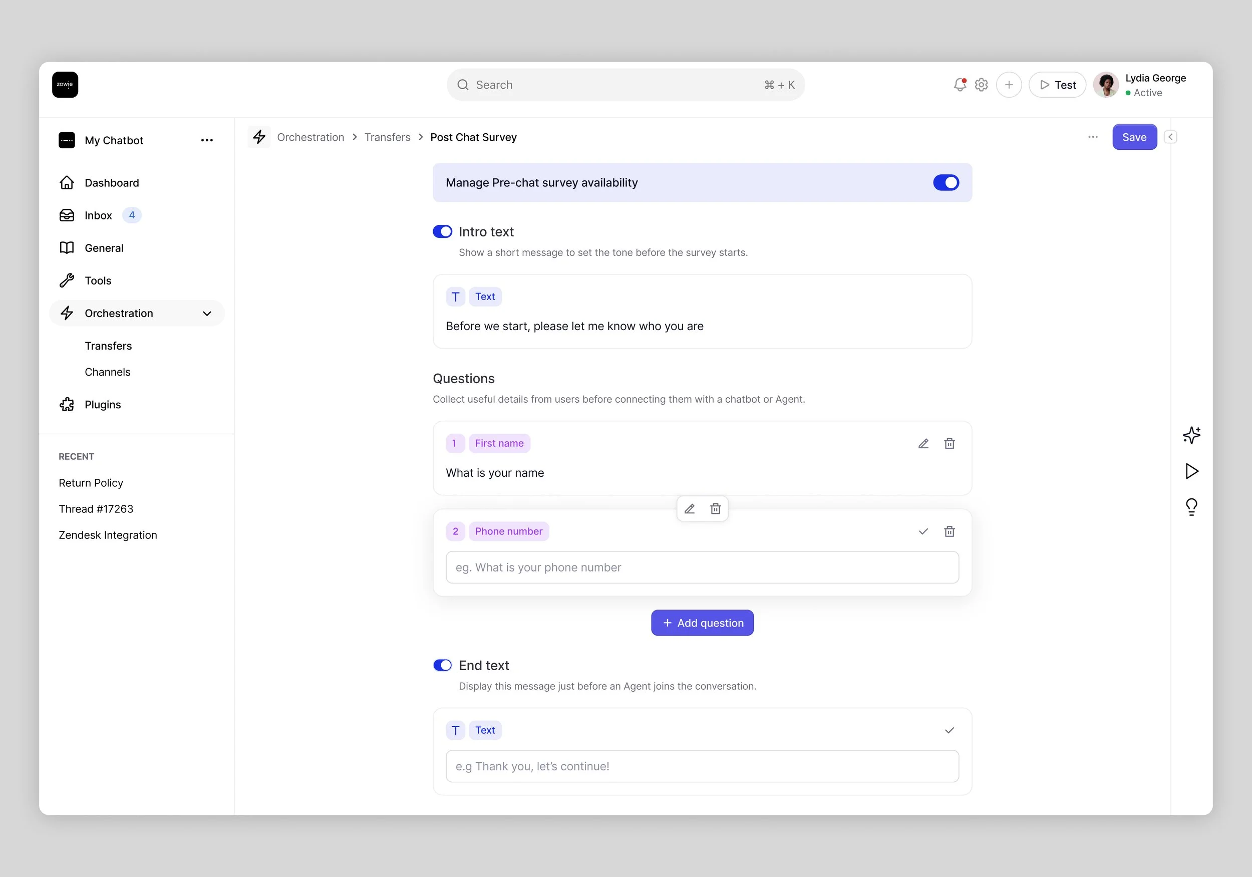 This page template has been reused multiple times within the Zowie app. I’ve applied this pattern to Surveys, the Order Tracking module, as well as Post- and Pre-Chat surveys. The initial idea was to present a simplified version of the form that reflects a conversational approach—mirroring how content appears in a real conversation. More advanced options were available in edit mode.
